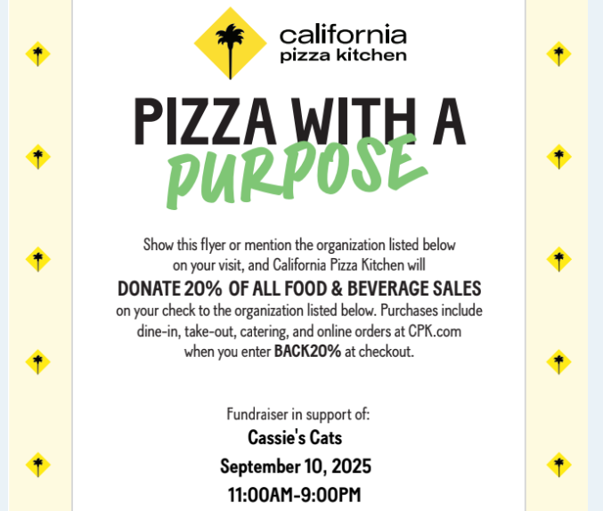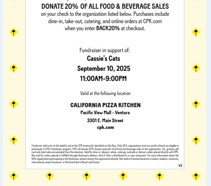 California Pizza Kitchen in Ventura at the Pacific View Mall is hosting a fundraiser for us on Wednesday, September 10th! Show them the flyer on your phone or mention Cassie’s Cats when you order. Online, use code BACK20% when you place your order.