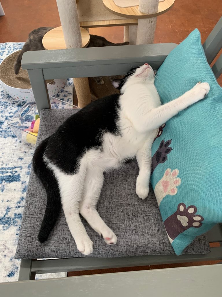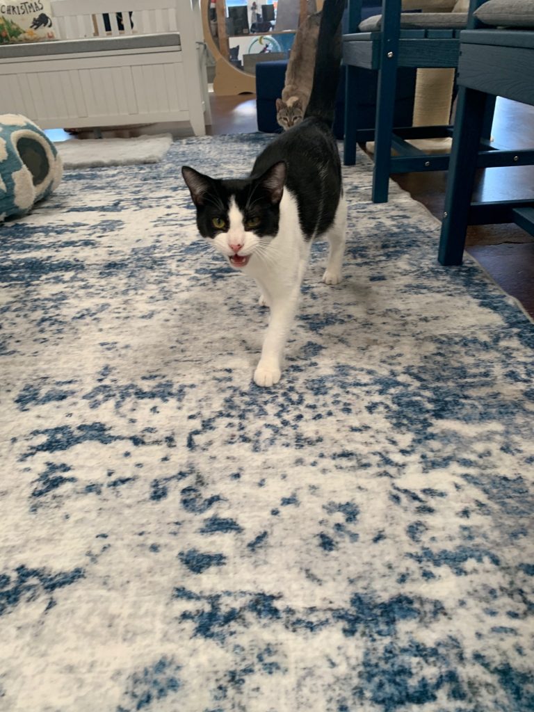 Book and Butler are high-energy, friendly, playful tuxedo boys. While not brothers, they act like siblings and even spend time grooming each other. Based on what we’ve seen, we are adopting these two boys together. They came to us from Shannon’s Fosters who also agree that these two boys would be great staying together.