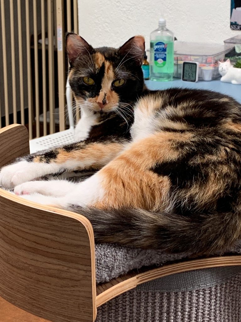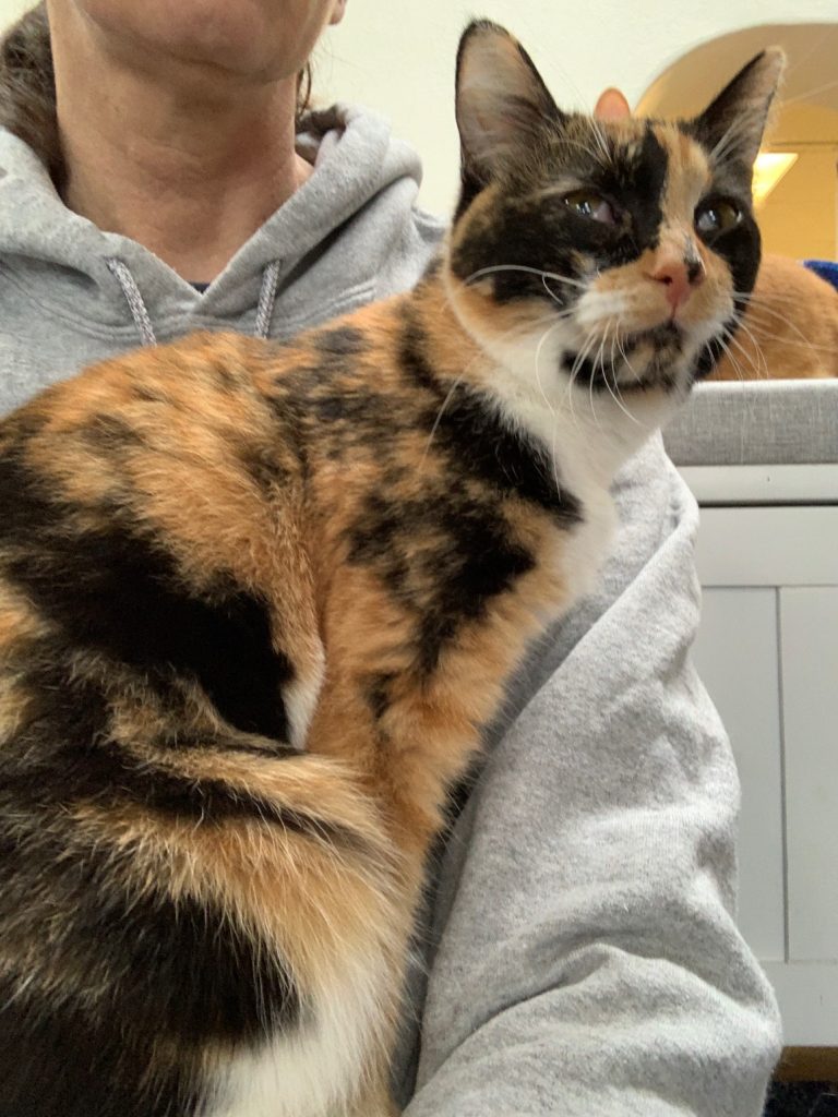 She was adopted but after 3 months, she and the resident cat were fighting, so her adopter made the difficult but necessary decision to return her to us. Dotty’s next home will need to be as a solo cat.