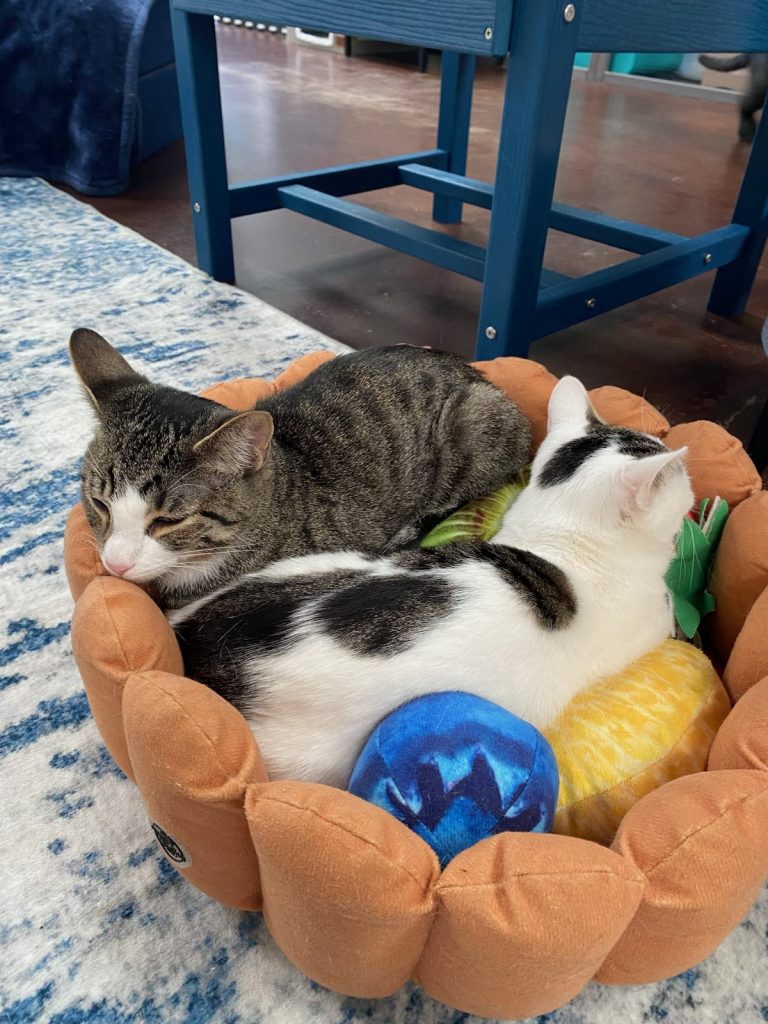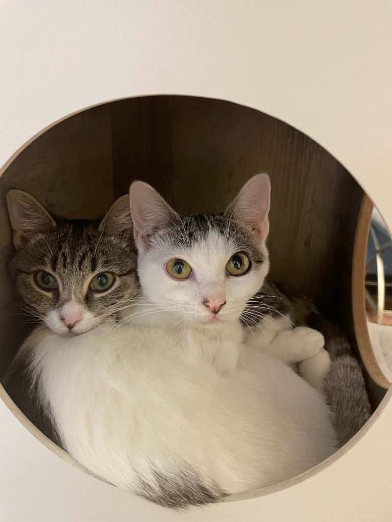 Eliza and Elliot are a sister-brother pair who joined us from Shannon’s Fosters. Eliza is white with brown tabby patches while Elliot is brown tabby with white accents. They are playful, adventurous, and ready to bring lots of laughs and joy to their new home! We are adopting them out together (their two sisters have already been spoken for).