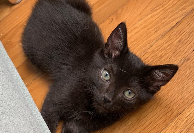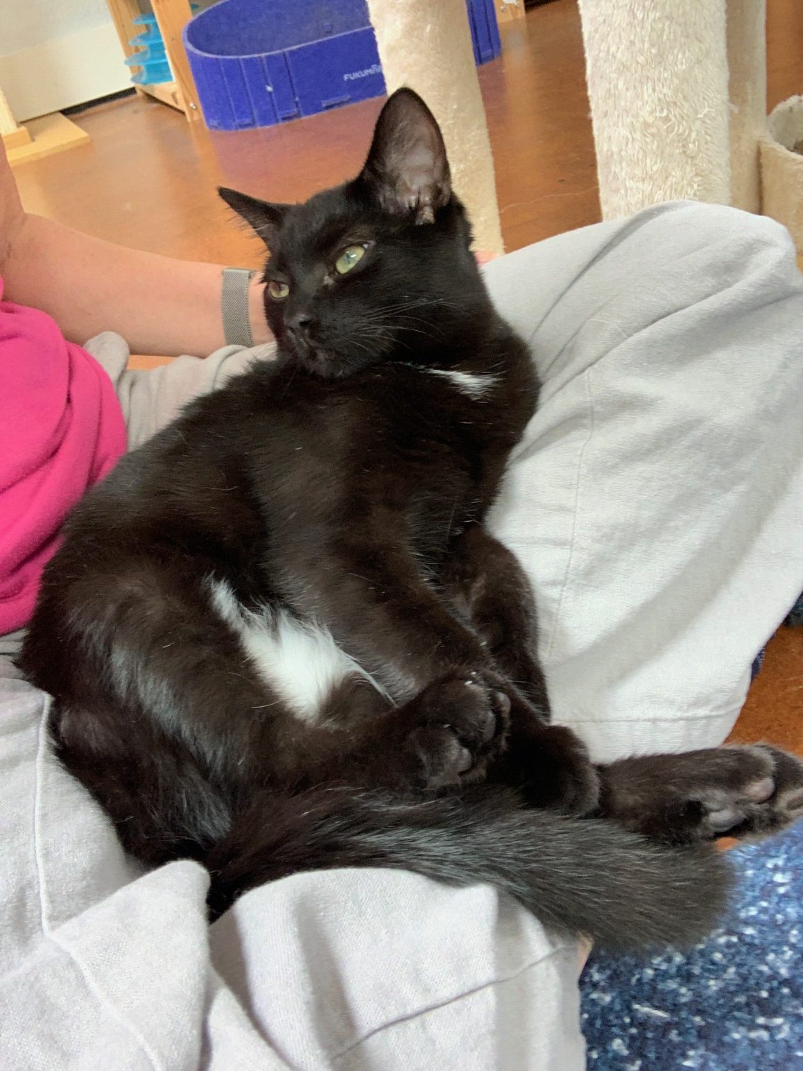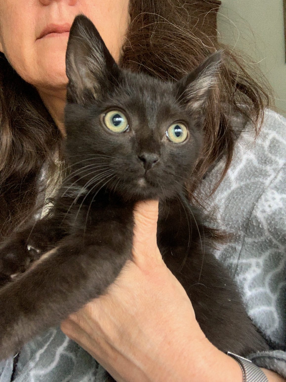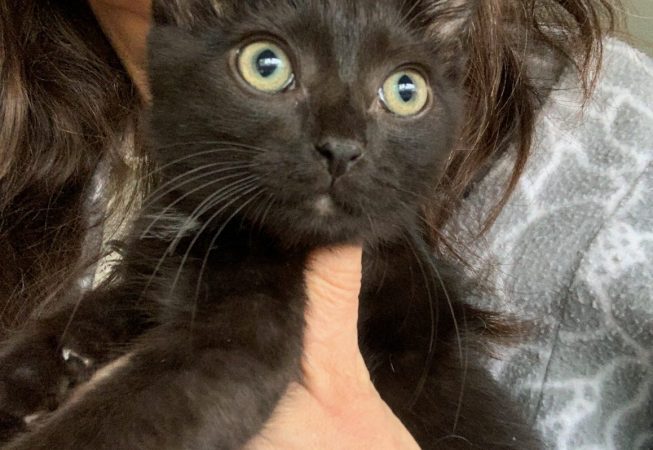 Huey is a very friendly little kitten who looks all black but is secretly sporting a white funny and chest! He’s an all-around nice cat.