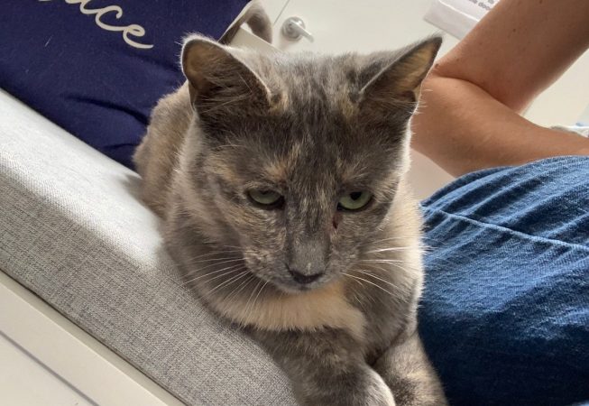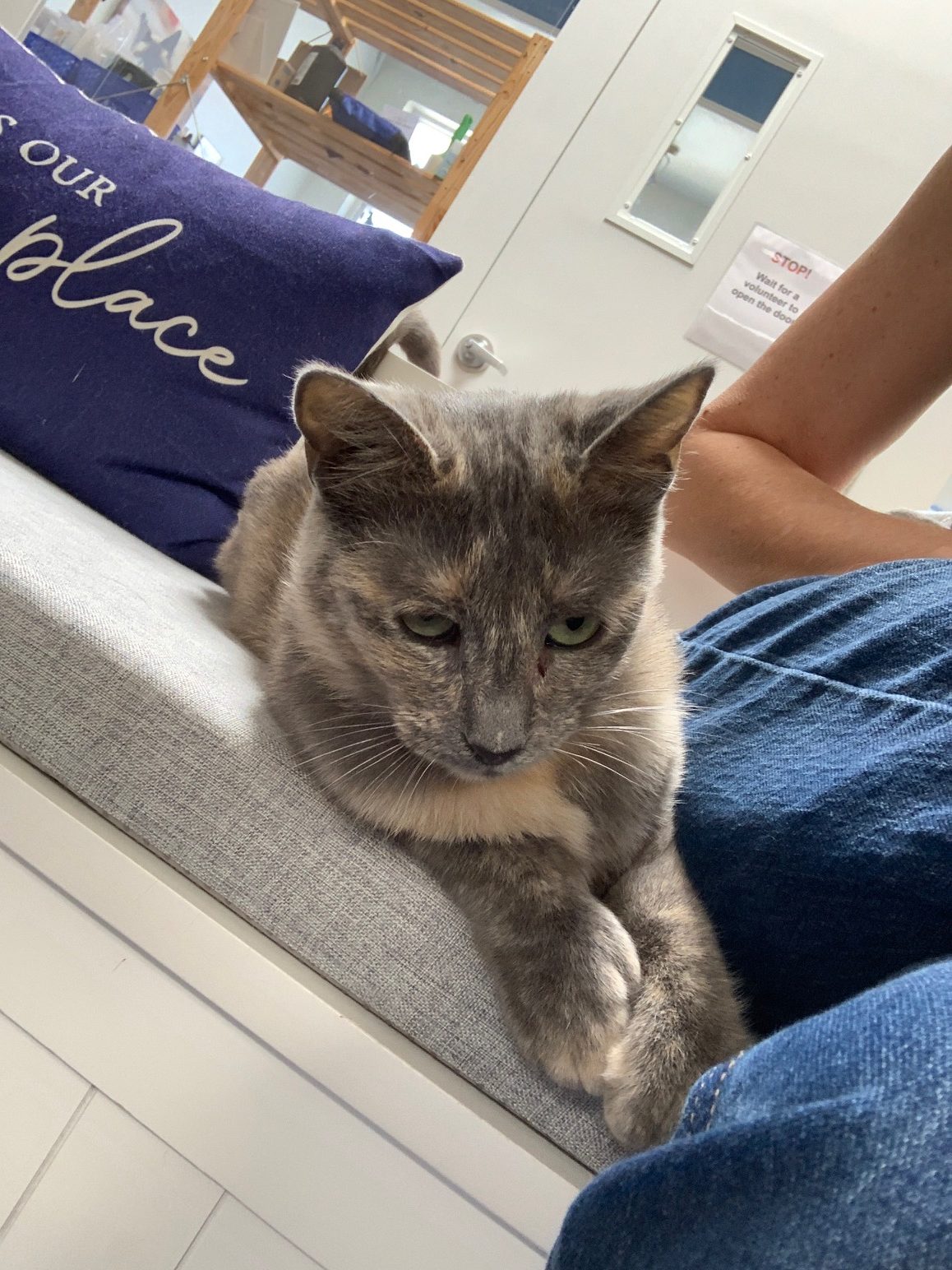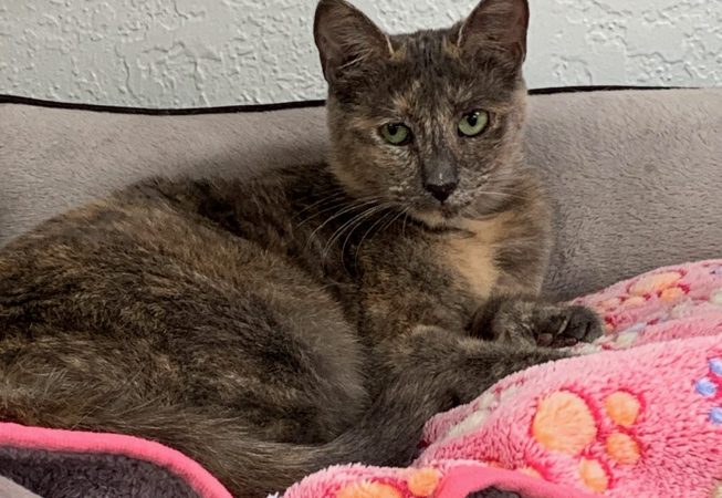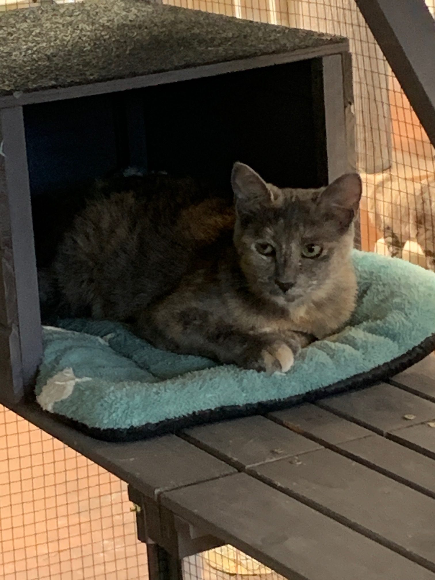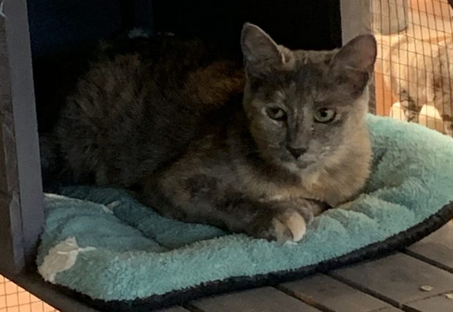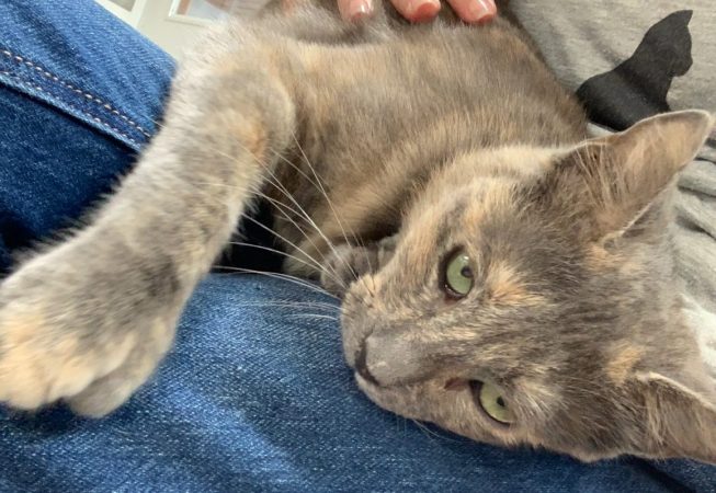 Jane came to us from Shannon’s Fosters. She is a very friendly and loving dilute tortie polydactyl kitty. She is good with other cats, super playful, and loves to be pet and get fed her favorite treats. She can be insistent about receiving human attention sometimes! She’s a very sweet cat. She and Amber are very friendly with each other and would be a wonderful pair for any home looking to adopt two cats.
